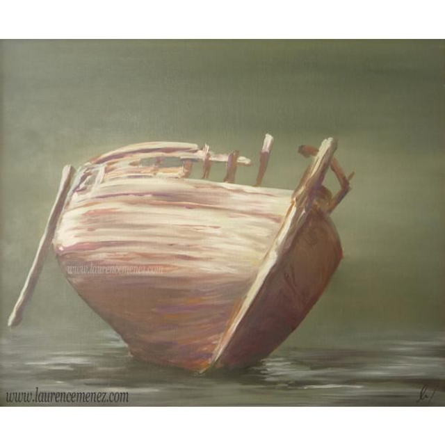 Tableau en peinture à l'huile représentant une épave de bateau de Camaret-sur-Mer, tons grisés.