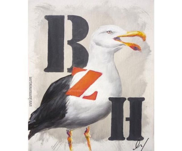 Tableau en peinture à l'huile représentant un goéland sur fond blanc avec inscription "BZH" en gris et orange.