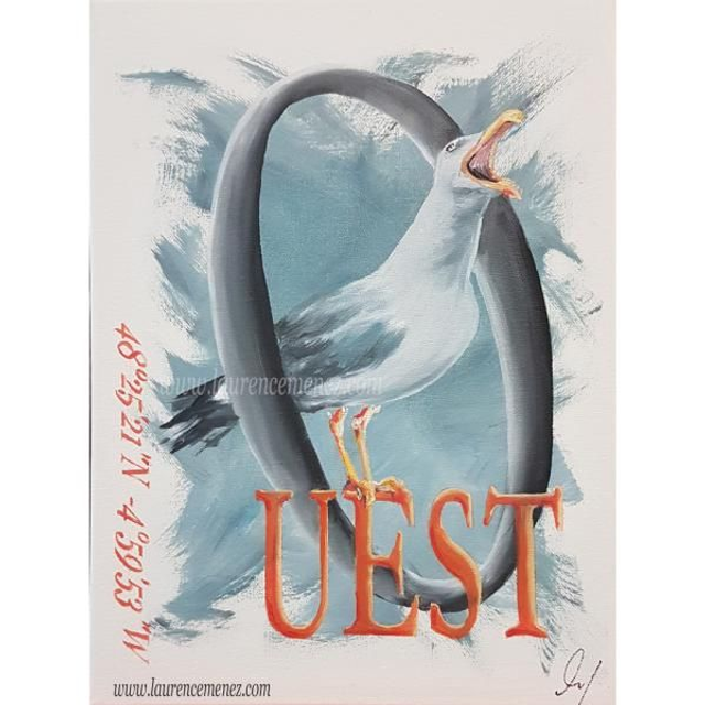 Tableau en peinture à l'huile représentant 1 goéland sur fond gris clair dégradé, inscription "OUEST" et position gps.