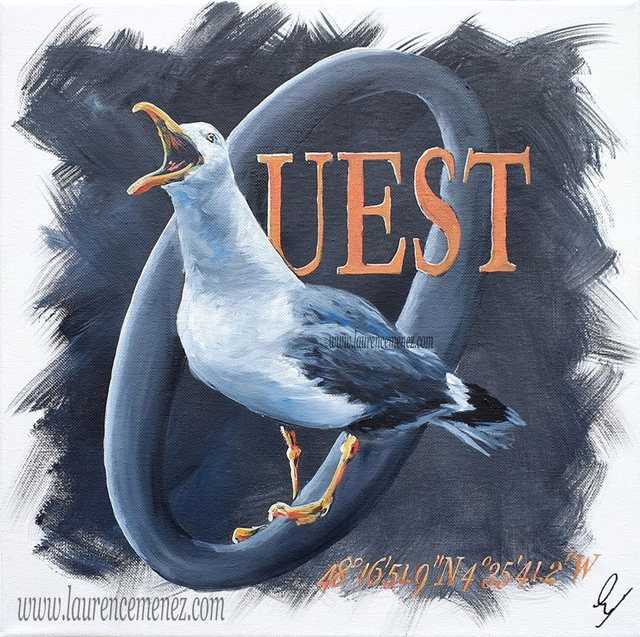Tableau en peinture à l'huile représentant 1 goéland sur fond gris dégradé avec inscription "OUEST" et position gps.