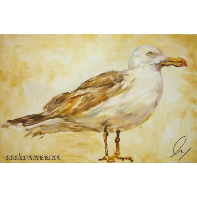Tableau en peinture à l'huile représentant un goéland dans le teintes jaunes.