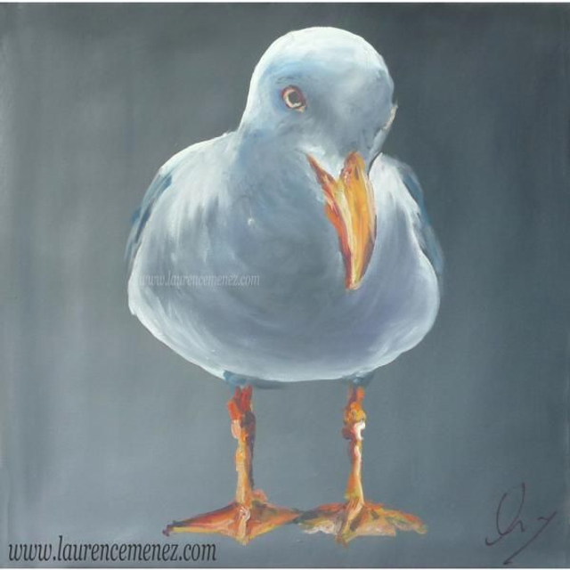 Tableau en peinture à l'huile représentant un goéland sur fond gris dégradé.