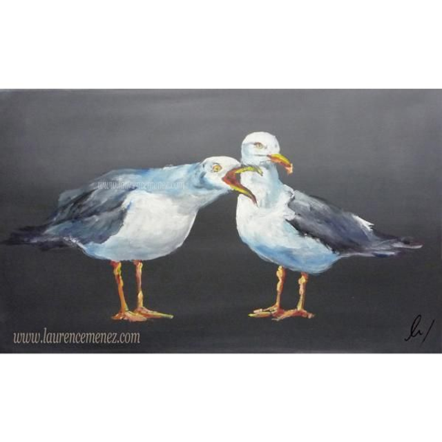 Tableau en peinture à l'huile représentant un couple de goélands sur fond gris dégradé.