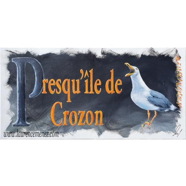 Tableau en peinture à l'huile représentant 1 goéland sur fond gris dégradé avec inscription "Presqu'île de Crozon" et position gps.