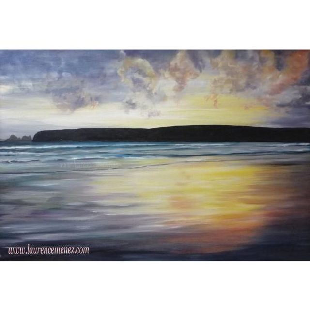 Tableau en peinture à l'huile représentant la plage de kersiguénou (Presqu'île de Crozon) au soleil couchant.