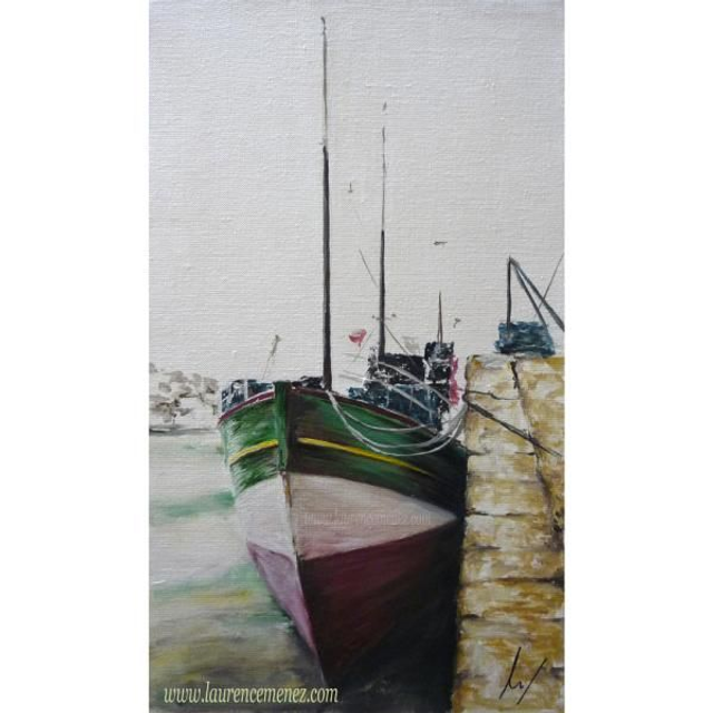 Tableau en peinture à l'huile représentant "la Janine", bateau de pêche dans le port de Camaret-sur-Mer.