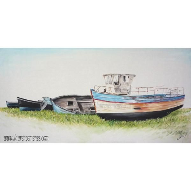 Tableau en peinture à l'huile représentant des bateaux dans le cimetière de bateaux du Fret à Crozon.