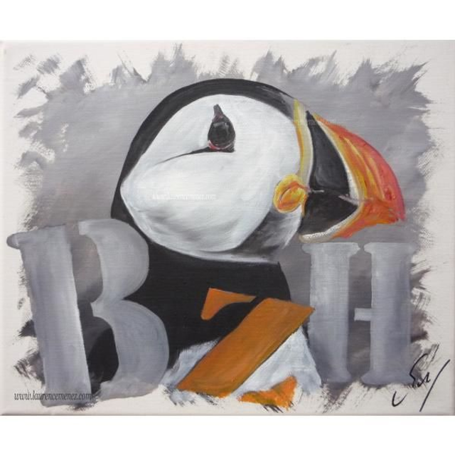 Tableau en peinture à l'huile représentant un macareux sur fond gris dégradé avec inscription "BZH" en gris et orange.