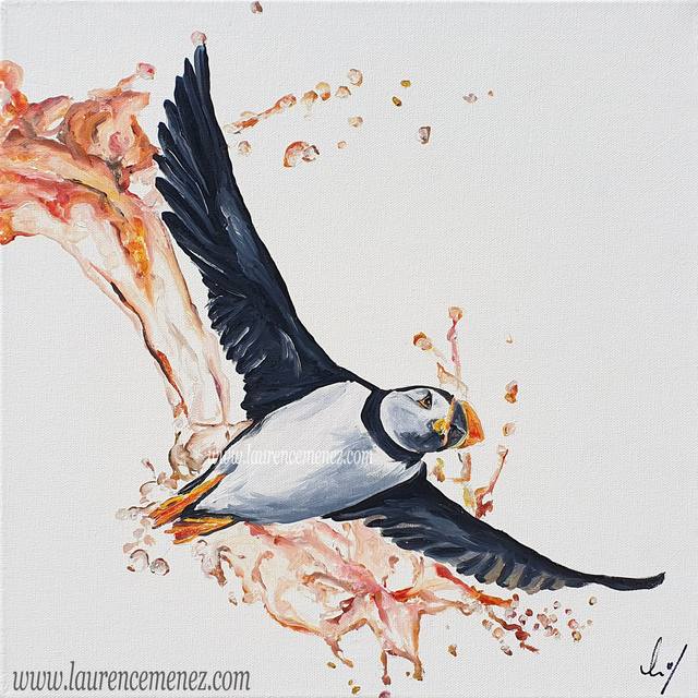 Tableau en peinture à l'huile représentant un Macareux dans une éclaboussure d'eau orangée.