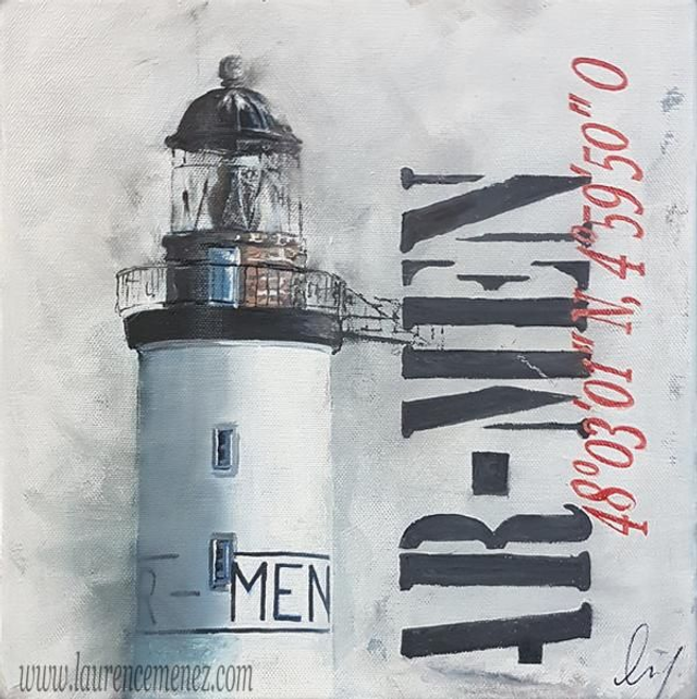Tableau peinture à l'huile représentant le Phare d'Ar-Men sur fond Blanc grisé avec texte gris, et position GPS du phare en rouge.