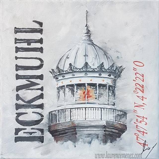 Tableau peinture à l'huile représentant le Phare d'Eckmühl sur fond Blanc grisé avec texte gris, et position GPS du phare en orange.