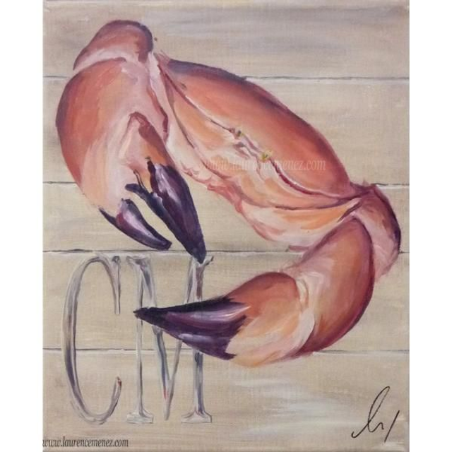 Tableau en peinture à l'huile représentant un Tourteau sur un fond imitation bois rosé avec inscription "CM".